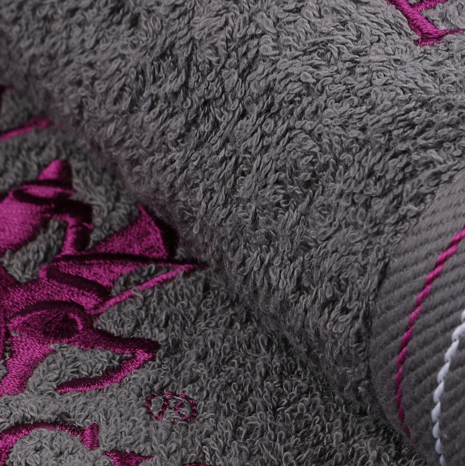 This is a set, made of 100% cotton, 480gsm, in dark gray color with purple and white details.